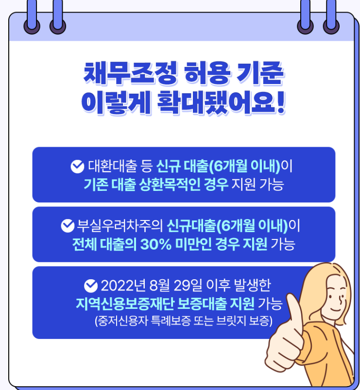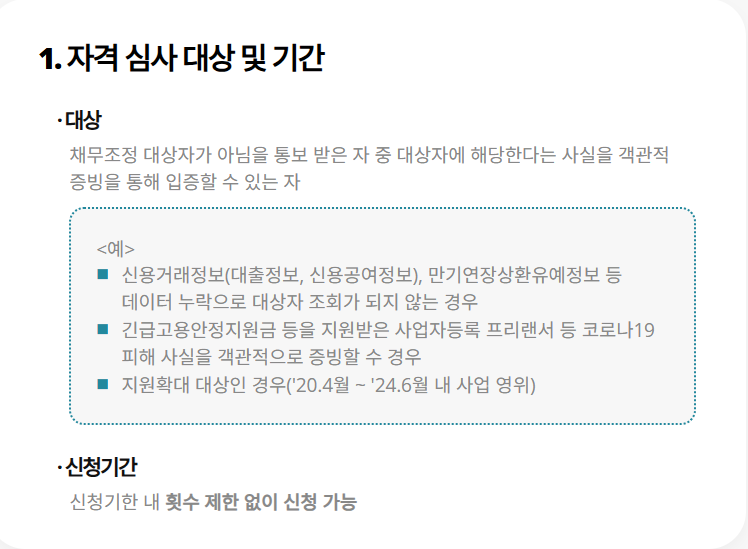 | 지원 대상 | 연체 90일 이상 채무자, 자영업자, 소득 감소자 |