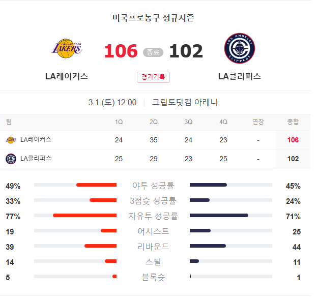 - LA 레이커스 106 - 102 LA 클리퍼스 (레이커스 5연승!)