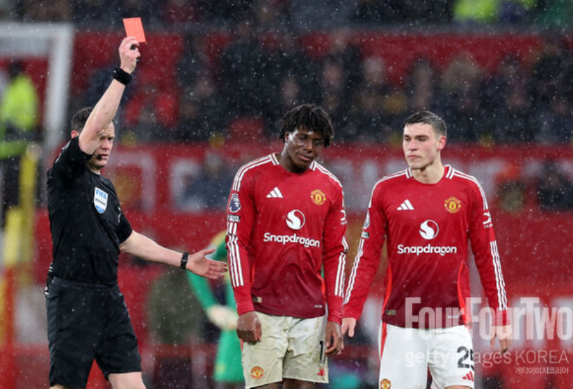 전반 43분, 맨유의 패트릭 도르고가 거친 태클을 하며 디렉트 레드카드를 받았습니다!