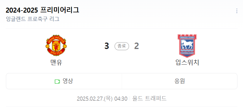 오늘은 2025년 2월 27일에 열린 맨체스터 유나이티드 vs 입스위치 타운 프리미어리그 경기를 리뷰해 보겠습니다.