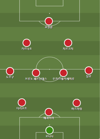 오 나나(GK)/ 마즈라위, 매과이어, 더 리흐트, / 달롯, 페르난데스, 우가르테, 도르고 /, 지르크지, 가르나초/ 포일룬