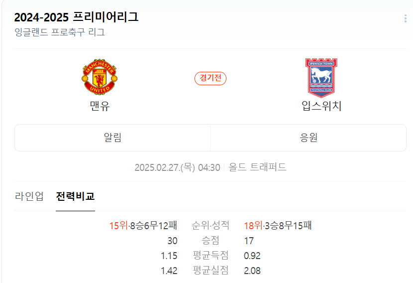 특히, 최근 맨유가 후방 빌드업에서 실수를 연발하고 있다는 점을 감안하면, 입스위치가 초반부터 강하게 압박을 시도하며 득점 기회를 노릴 가능성이 높습니다.