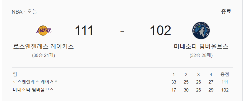 🔥 LA 레이커스 111 - 102 미네소타 팀버울브스 🔥