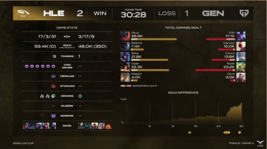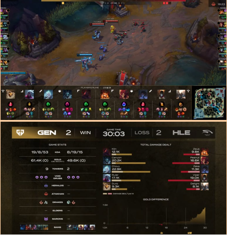Chovy는 미드 라인을 장악하며 경기의 흐름을 주도했고, 젠지는 오브젝트 컨트롤을 통해 30분 만에 깔끔한 승리를 거뒀습니다.